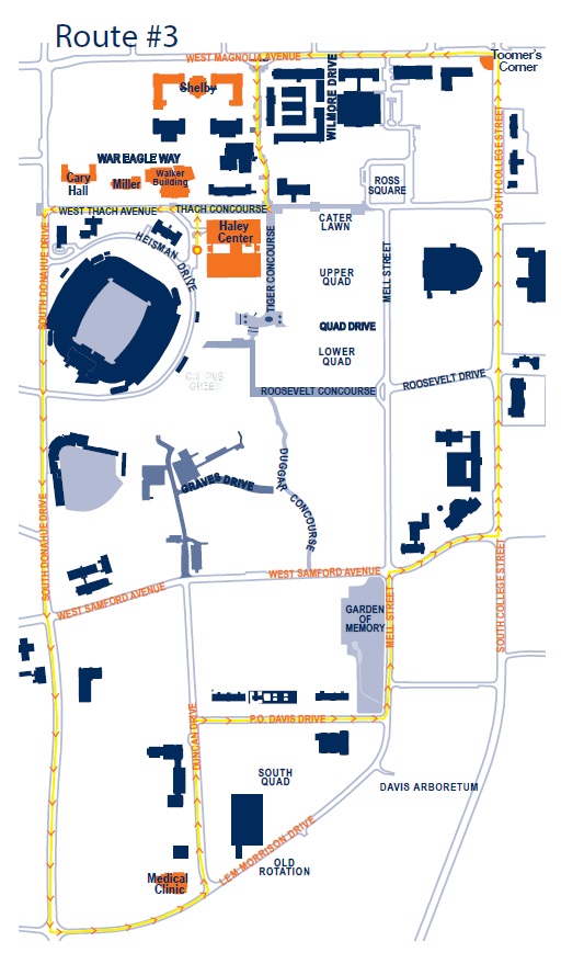 This 3-mile route begins from the northwest corner of the Haley Center, near the loading dock, and proceeds west along the Thach Concourse toward South Donahue Drive.